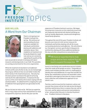 Freedom Institute publishes TOPICS, our well known and respected newsletter. Issues are published in both the spring and the fall and filled with articles written by Freedom Institute’s esteemed clinical staff, and the occasional guest writer. This is also the place to stay connected to Freedom Institute and its current events. Sign up to receive our e-news and TOPICS below.